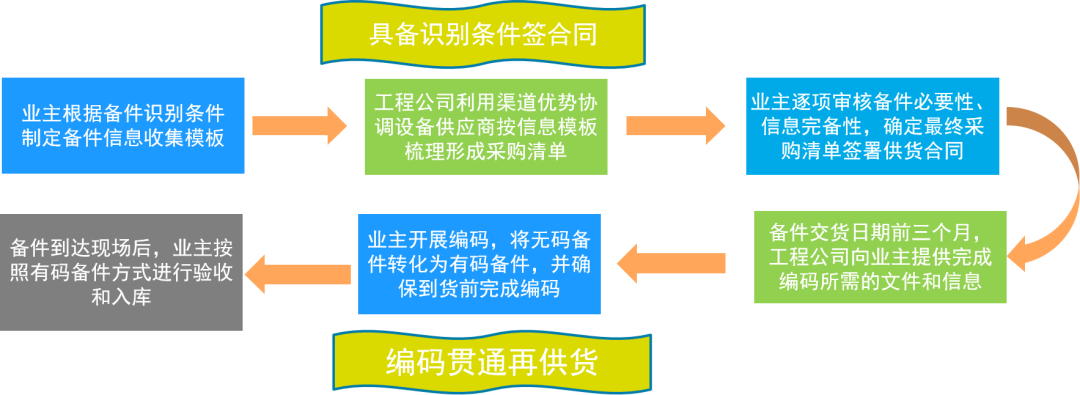 惠州公司合同采购部与维修部组成的项目团队主动作为,誓要啃下SO备件采购这块硬骨头,在经过多方调研、摸清问题、理顺业务逻辑后,果断放弃传统的CPR机组SO备件供货模式,即备件到货后再识别移交的模式,创新采用“信息梳理-确定清单-编码供货”的方案,即根据工作实际要求先行完成前端备件信息收集,再确定清单范围,待满足编码入库要求后进行供货的“惠州方案”(见下图)。