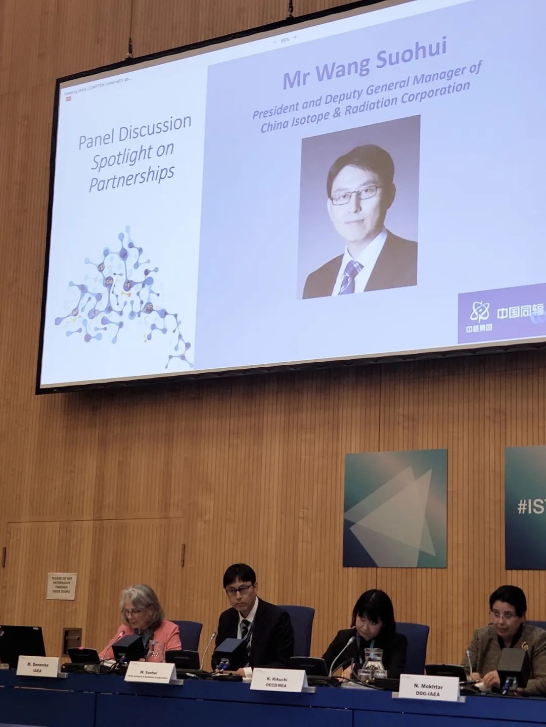 中国同辐王锁会董事长18日出席IAEA副总干事Najat Mokhtar主持的“IAEA协作中心在放射性药物发展中的作用”边会,介绍了中国在放射性药物发展推广方面所取得的成绩与中长期规划,以及中国同辐IAEA放射性药物及放射源协作中心开展的工作和计划。中国同辐杜进总工程师19日在“锝-99m标记药物研发与生产”专题会议上,系统介绍了中国锝-99m标记药物的使用情况与最新的研发进展。
