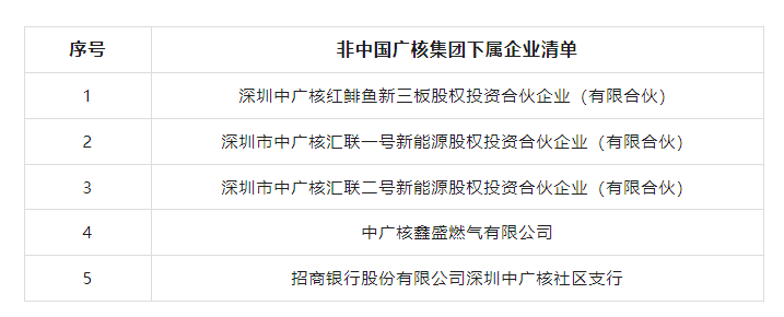 深圳中广核红鲱鱼新三板股权投资合伙企业(有限合伙)、深圳市中广核汇联一号新能源股权投资合伙企业(有限合伙)、深圳市中广核汇联二号新能源股权投资合伙企业(有限合伙)、中广核鑫盛燃气有限公司、招商银行股份有限公司深圳中广核社区支行等5家企业在企业名称中使用“中广核”字样。鉴于该5家企业目前并非我集团下属企业,我集团郑重澄清并严正声明如下: