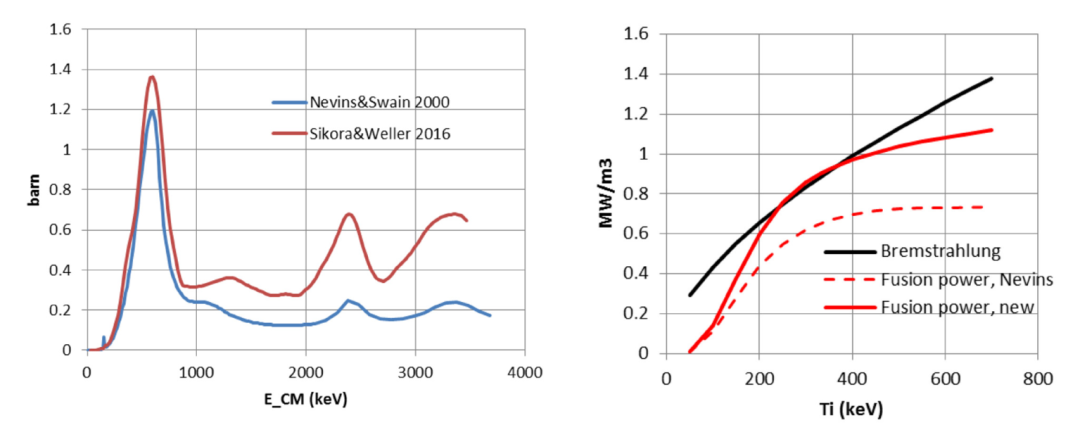 图2 氢-硼核反应截面(左),氢-硼聚变功率与韧致辐射功率在不同截面数据下与离子温度的关系(右)