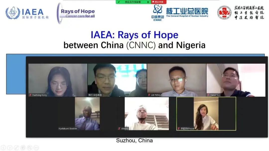 为贯彻落实习近平总书记关于携手构建新时代中非命运共同体的重要论述精神,积极响应国际原子能机构(IAEA) “希望之光”(Rays Of Hope)倡议,当地时间4月25日至26日,在国家原子能机构(CAEA)和中国驻尼日利亚大使馆指导下,由中核集团主办的首期中国—尼日利亚“肿瘤诊断和治疗”培训在云端举办。由核工业总医院、核工业四一六医院医师,以及国内知名医院癌症治疗领域专家进行授课,授课内容涵盖核医学、放疗学及先进医疗技术应用等13门课程。