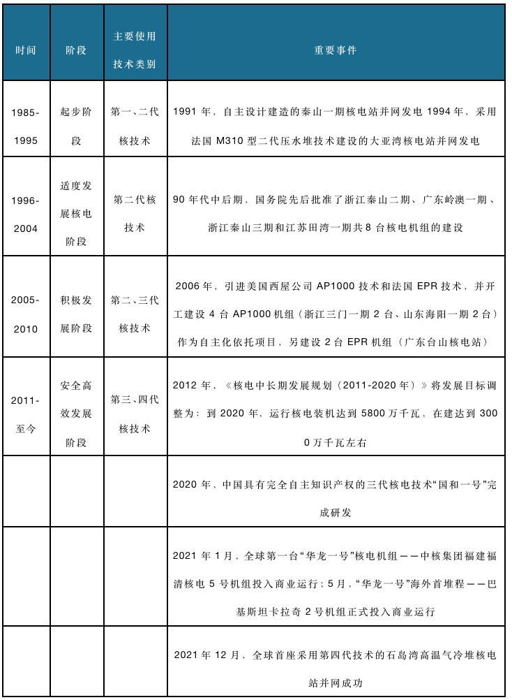 核电产业发展在国家政策的推动和引导之下,技术进入第三、四代领域,尤其是在2021年12月,全球首座采用第四代技术的石岛湾高温气冷堆核电站并网成功,我国四代核技术已迈入安全高效发展阶段。