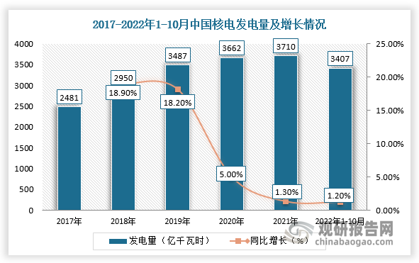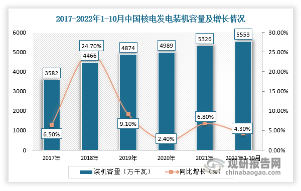 根据数据显示,2021年,中国核电发电量3710亿千瓦时,同比增长1.3%,装机容量5326万千瓦,同比增长6.8%,6000千瓦及以上核电厂发电设备利用7802小时,同比增长4.7%;截止2022年1-10月,中国核电装机容量5553万千瓦,同比增长4.3%,核电新增装机容量474万千瓦,同比下降112万千瓦,发电量3407亿千瓦时,同比增长1.2%,核电发电设备累计平均利用6226小时,比上年同期减少245小时。同时,国家“十四五”规划纲要明确,到2025年在运核电装机7000万千瓦,预计到2025年,中国核电在建装机约5000万千瓦;到2030年,核电在运装机容量达到1.2亿千瓦,核电发电量约占全国发电量的8%。由此可见,我国核电行业发展空间大。