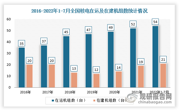 根据数据显示,截至2022年7月,我国在运核电机组累计为54台,装机容量约52150兆瓦,在建核电机组共21台(其中有10台采用的是华龙一号),总装机容量约23511兆瓦,并且在运及在建核电机组均位于沿海地区。