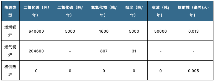 目前,我国大部分地区冬季取暖主要使用的是燃煤,导致该地区雾霾困扰大。而核能供热仅仅产生微量的放射性物质,不会产生二氧化碳、二氧化硫、氮氧化物、烟尘、灰渣等排放物,如功率为400MWt的热源,核能供热将产生0.005毫希/人·年的放射性物质,与燃煤锅炉产生的0.013毫希/人·年的放射性物质相比偏低。
