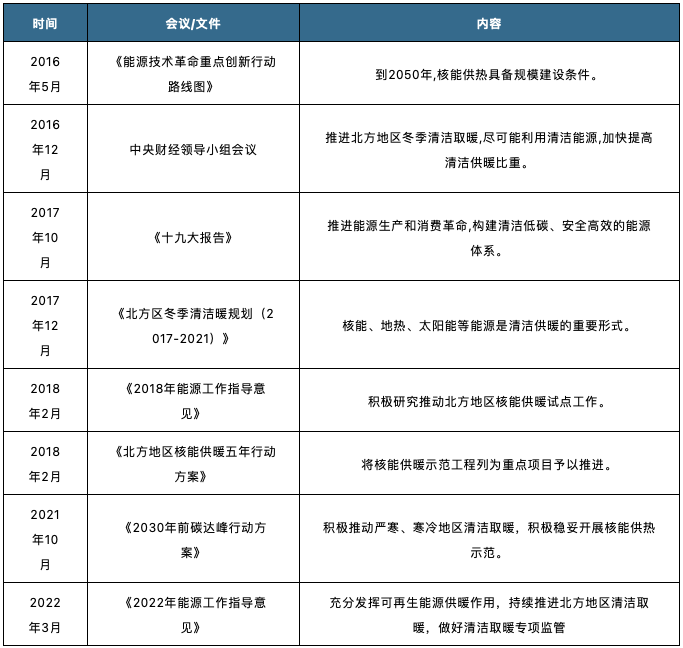 因此,近年来,国家出台了一系列相关政策,我国核能行业打开新成长空间,供热领域面临重大机遇。例如,国家发展改革委发布的《能源技术革命创新行动计划(2016-2030年)》指出,到2050年,核能供热具备规模建设条件。此后,一系列支持核能供热的政策相继出台。