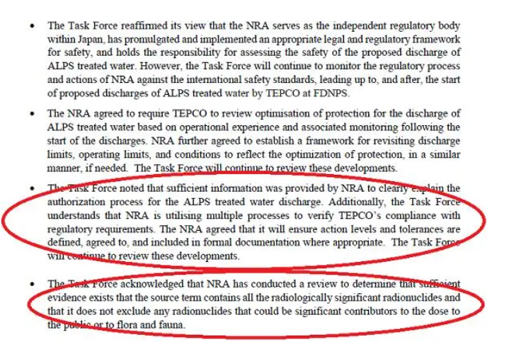 NRA已通过一次审查确定,有足够的证据表明,处理水的监测源项包含所有具有辐射影响的放射性核素,并且在其评估中未排除任何可能对公众或动植物构成重大辐射剂量的放射性核素。