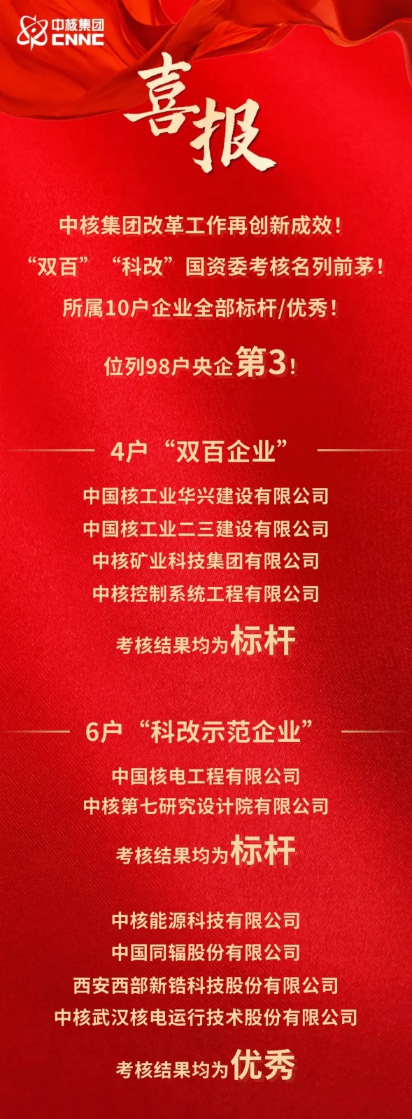中核集团改革工作再创新成效!“双百”“科改”国资委考核名列前茅!所属10户企业全部标杆/优秀!位列98户央企第3!