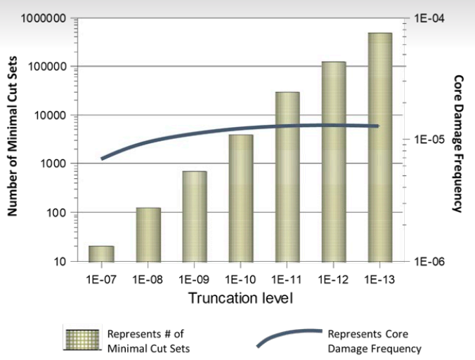 作为核电站PRA中复杂性类型的一个例子,见右图,随着通过将PRA模型量化截断水平降低到越来越小的值来捕获额外的细节,最小割集的数量(即,电厂可能经历堆芯损伤方式的不同组合)变得非常大,其中组合不被认为低于该频率水平。