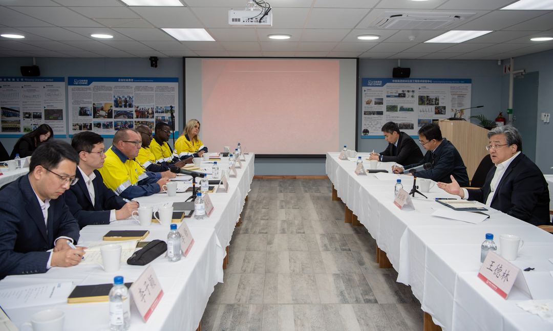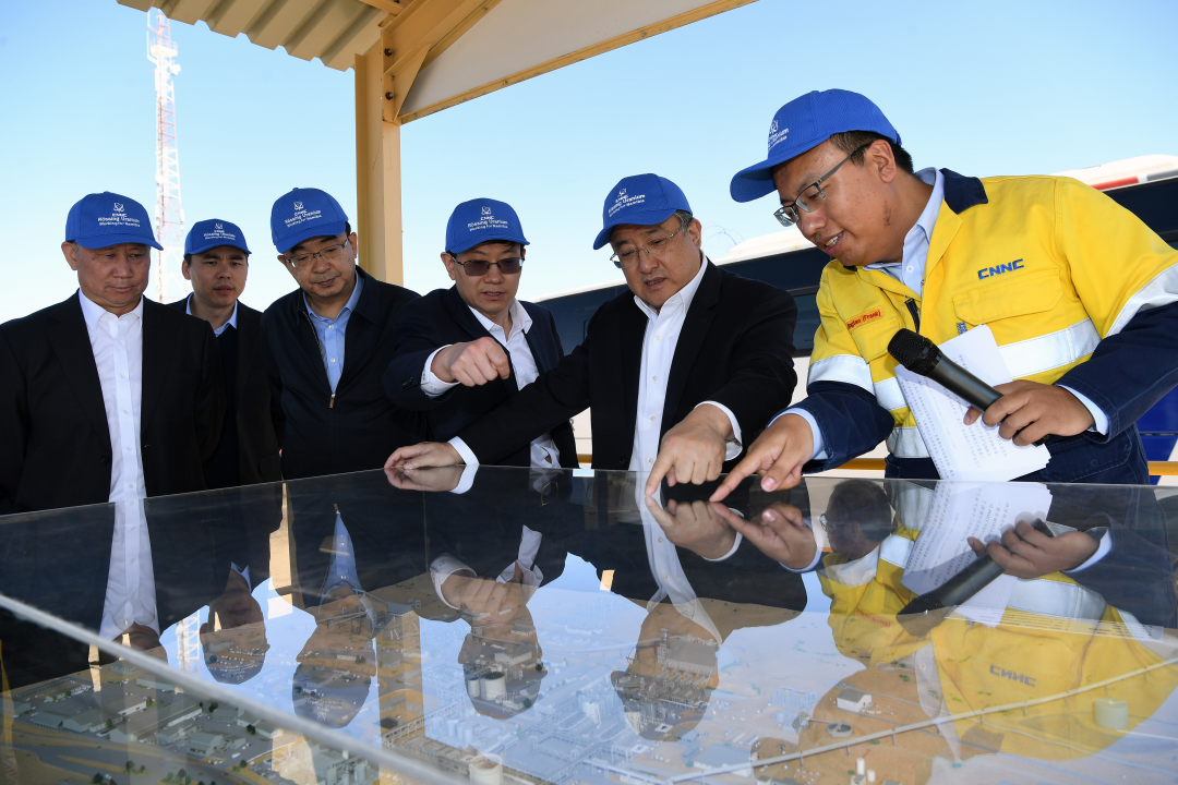访纳期间,余剑锋一行还赴罗辛铀矿现场检查指导工作,详细了解罗辛铀矿生产经营情况和中国铀业海外开发工作,深入罗辛铀矿采矿水冶生产一线,实地了解了罗辛铀矿资源储量、生产运行情况以及铀矿采冶工艺技术流程和未来开发计划。同时,余剑锋向辛勤奋斗在罗辛项目上的中纳两国员工致以诚挚问候。