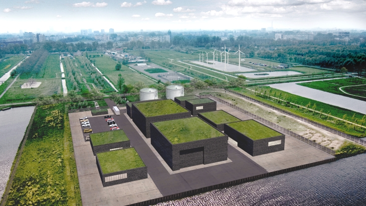 艺术家展示了一个典型的FLEX反应堆阵列——右边32栋建筑。在左边,可以看到涡轮机岛旁边的蓝色GridReseve储罐(由MoltexFLEX提供)。