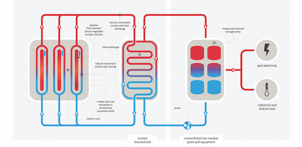 与所有其他熔盐反应堆相比,SSR的根本独特之处在于,它们将放射性燃料盐限制在类似于传统反应堆中燃料组件的管道中。其后,一种单独的非放射性熔盐将热量从反应堆堆芯转移到热交换器。