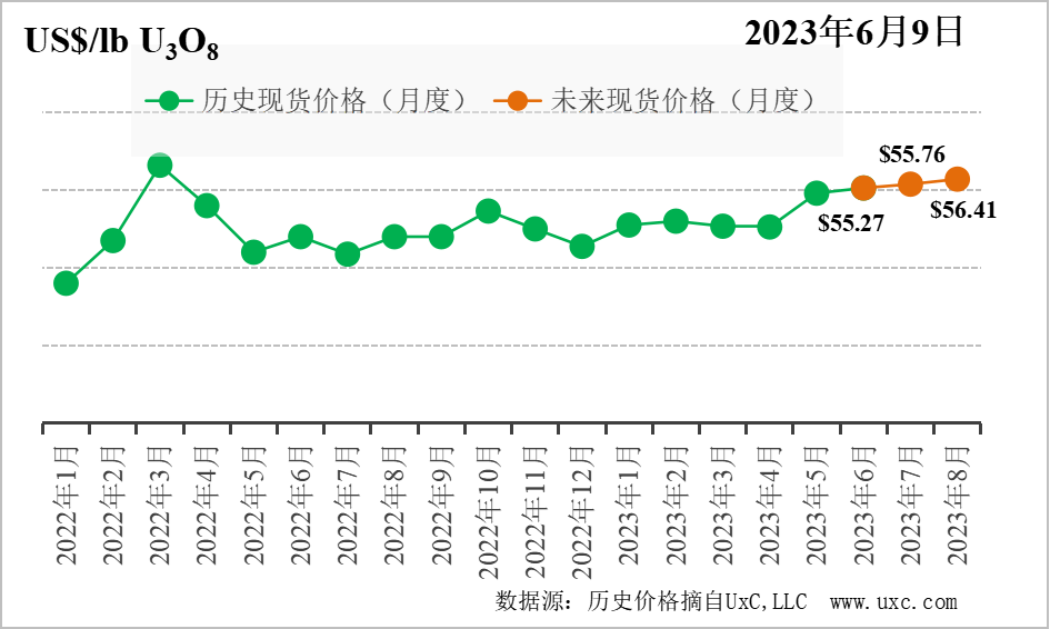 5月份现货价格整体呈上涨趋势,但市场交易集中在最后一周。5月初的天然铀价格为53.70美元/磅,随后两周,由于市场交易冷清,现货价格小幅回落,并稳定在53.40美元/磅左右。5月第三周,一家美国核电企业发布了360万磅的采购需求,卖方报价增加,天然铀现货价格小幅增加至53.60美元/磅。本月最后一周,美国通过了制裁俄罗斯天然铀进口法案,天然铀价格上涨,月底价格收于54.60美元/磅。