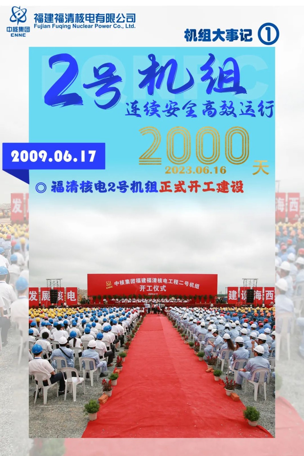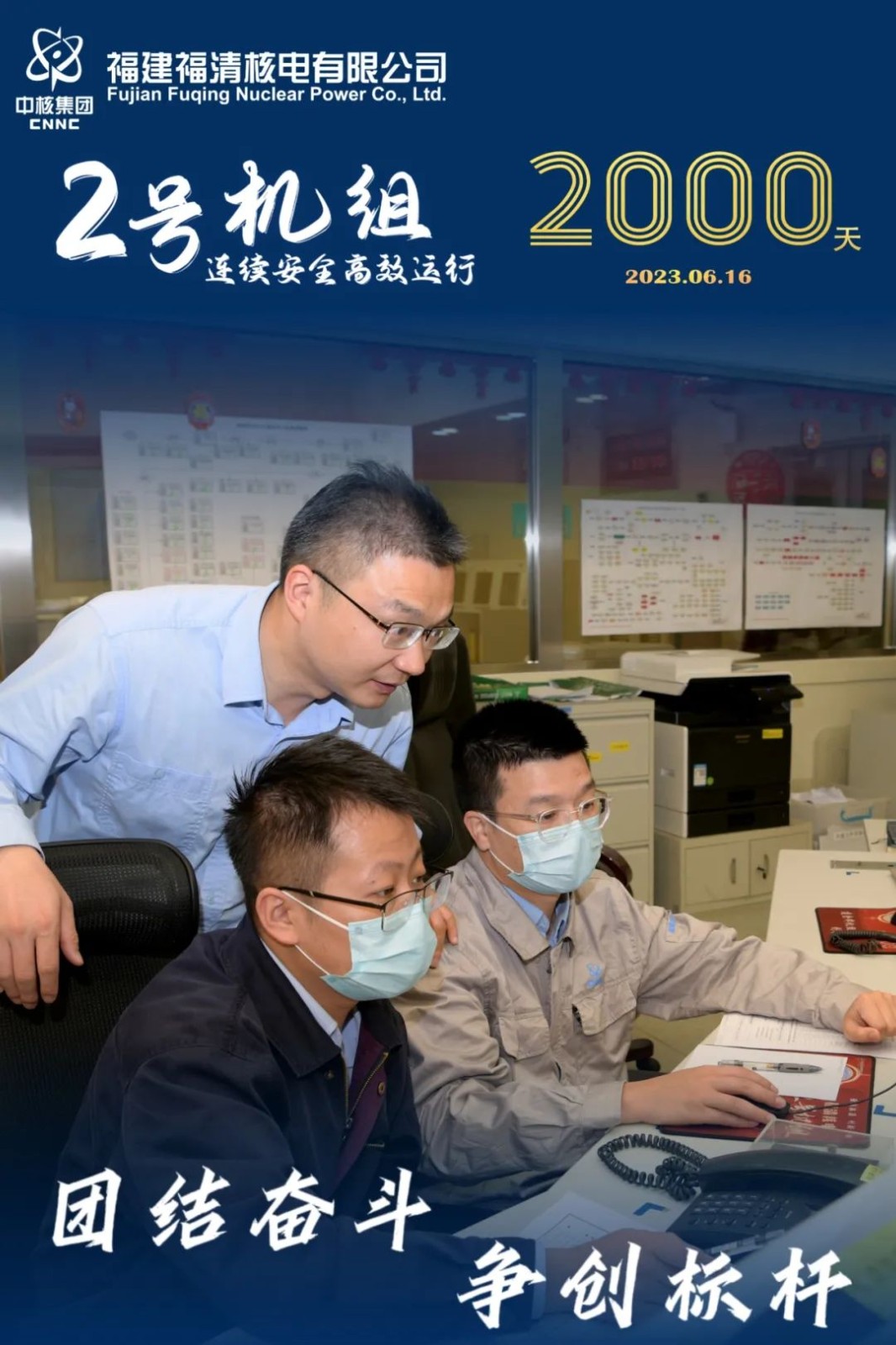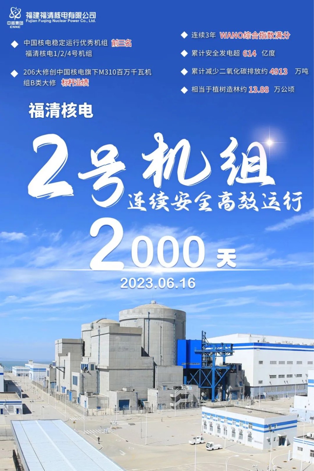 2023年6月16日,中核集团福清核电2号机组连续安全稳定高效运行2000天,创造新的优秀业绩,这是继2023年3月24日福清核电1号机组实现连续安全稳定高效运行3000天之后,取得的又一佳绩。