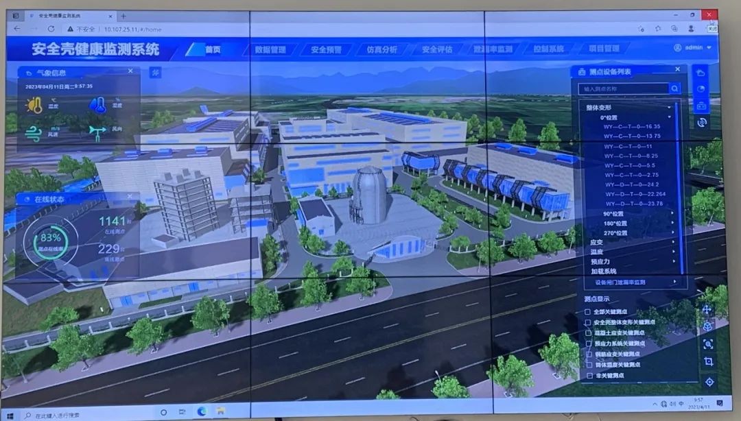 为贯彻落实公司数字化战略部署,本次试验采用了多项新工艺、新技术。开发了智能监测平台,实现智能辅助、智慧管理,监测平台针对安全壳模型的1500个传感器进行实时监测,收集加载过程中的应变、位移、预应力、温度以及壳内环境等数据,并对检测数据实时分析、预警,与智能终端深度融合,打造智慧试验新体系;对于裂缝测量,引入了无人机高精度摄像头采集数据、图像识别处理等技术,有效的节省了人力;创建了VR展厅,引入虚拟现实技术,实现空间复刻,可沉浸式漫游在安全壳模型里;应用了智能钢绞线技术,其几何、力学和传感性能均达到课题既定目标,具有易于施工、高精度、高耐久性、高成活率的有点,为核安全壳结构全寿命周期提供可靠的智能建造和智慧运维策略。