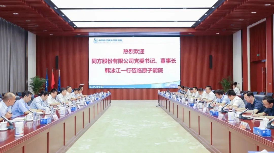 为落实集团党组主题教育读书班会议精神,加强与集团科研院所间的科技创新与成果转化、协同合作,6月16日,同方股份党委书记、董事长韩泳江一行赴中国原子能科学研究院(以下简称“原子能院”),与原子能院党委书记薛小刚等座谈交流。原子能院党委委员、总会计师陈首雷,同方股份党委委员、副总裁秦绪忠,副总裁燕宪文参与会谈。