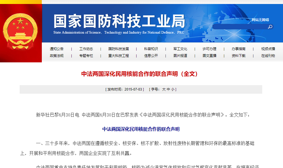 早在2015年06月30日,中法两国就在巴黎签署了《深化民用核能合作的联合声明》,感兴趣的可以通过阅读原文查阅。