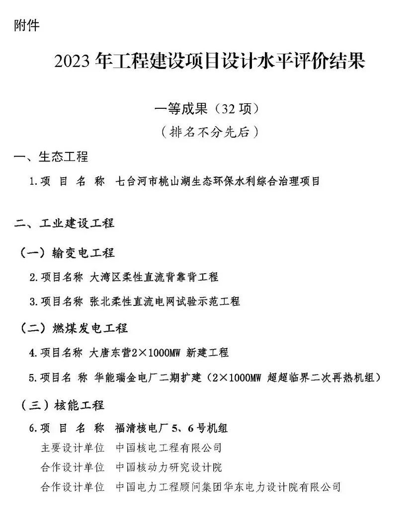 近日,中国施工企业管理协会公布了2023年工程建设项目设计水平评价结果,中国核电工程有限公司总包并作为主要设计单位联合中国核动力研究设计院和华东电力设计院有限公司设计的华龙一号示范工程——福清核电厂5、6号机组获工程建设项目设计水平评价一等成果奖。