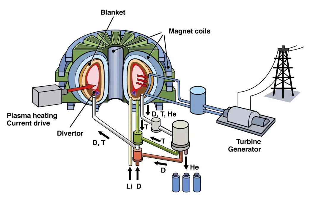 目前,可控核聚变的技术路线大体有三种,分别是重力场约束核聚变,激光惯性约束核聚变和磁约束核聚变。现今,磁约束核聚变研究中,托卡马克是已发展的最有希望利用热核聚变发电的技术方案,也被誉为“人造太阳”。托卡马克是一种利用磁约束来实现受控核聚变的环形容器,它的中央是一个环形的真空室,外面缠绕着线圈,在通电时内部会产生巨大的螺旋形磁场,将其中的等离子体加热到很高的温度,以达到核聚变的目的。
