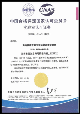 近日,海南核电有限公司辐射计量实验室收到经中国合格评定国家认可委员会(简称CNAS)审核颁发的实验室认可证书,标志海南核电有限公司辐射计量实验室的管理体系及技术能力达到国家(国际)认可水平。
