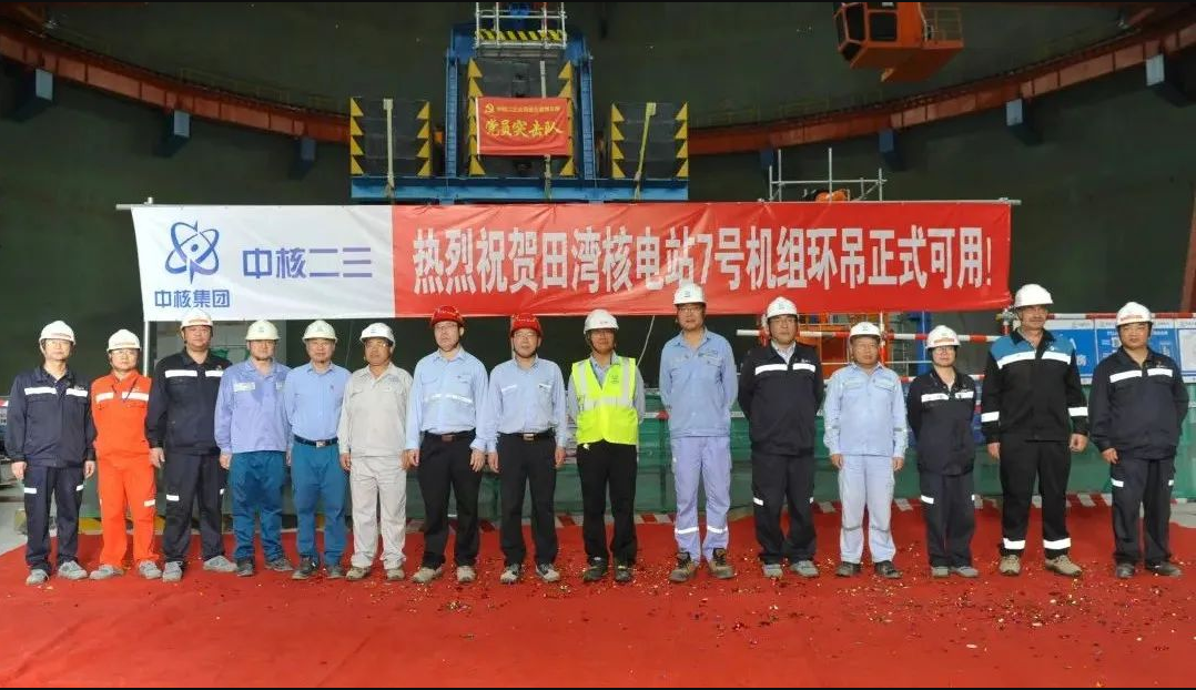 田湾核电站7号机组环吊施工安装开始于年初,为确保环吊可用节点顺利实现,连云港项目部在年初成立了党员突击队,全力以赴确保环吊施工安全、质量可控。31根环吊轨道及其2061套连接螺栓,345块轨道垫板及其1375套连接螺栓,685块轨道压板及其2050套连接螺栓,经过地面组装、吊装、调整等步骤,精确就位于相应位置,误差控制在5毫米以内,为后续主设备吊装及核岛主线关键路径施工奠定了坚实基础。