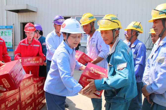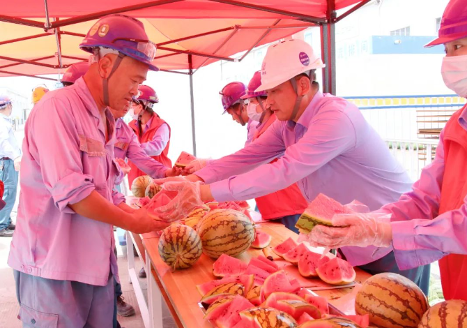 本次浇筑为跨昼夜连续作业,涉及人员、设备众多,作业人员身心健康也是重点任务之一。面对连续出现的高温天气,项目部严格实行“抓两头,歇中间”的避高温措施,科学安排项目工程量,优化调整施工工序。深度落实“夏送清凉”相关活动安排,在浇筑前为工人发放防暑降温物资,在核岛现场内设置茶水亭、轴流风机风扇,不间断提供淡盐水、凉茶、藿香正气水等防暑降温用品,为一线施工人员做好基础保障。在文明施工方面,还在核岛周边安装喷淋系统,有效控制现场扬尘并为施工作业起到局部降温作用。