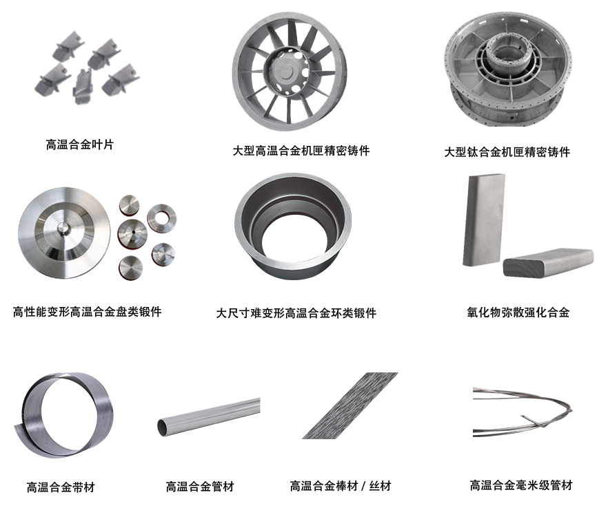 公司主要从事高温合金和铝镁钛轻质合金等高端金属材料及制品的研发、生产和销售。公司主要产品领域为六个方面:精密铸造领域,高温合金、铝镁钛轻质合金熔模精密铸造产品;盘环类锻造领域,高温合金、钛合金、钛铝合金、低膨胀合金盘环类锻件;粉末冶金领域,高温合金粉末盘、氧化物弥散强化合金产品;精细制造领域,高温合金、耐蚀合金、司太立合金板棒丝带管等精细产品;离心铸造领域,高温合金、耐蚀合金离心铸造乙烯裂解管、冶金炉管等;新型制造领域,增材制造、真空水平连铸、泡沫金属等新型制造工艺产品。近年来公司通过不断优化资源配置,积极稳妥推进产业建设的步伐,贴近客户打造产业基地,初步完成以北京为总部、六省七市十厂的产业布局。