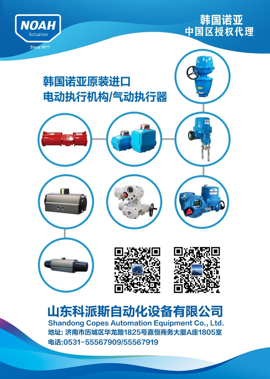 山东科派斯自动化设备有限公司为韩国诺亚(NOAH)执行机构有限公司正式授权的中国区代理,在中国负责销售诺亚(NOAH)品牌MA多回转、NA角行程、SA精小型、NL直行程等系列电动执行机构和NOD、NOS拨叉式,RD、RS齿轮齿条式和HA大扭矩等系列气动执行器产品。
