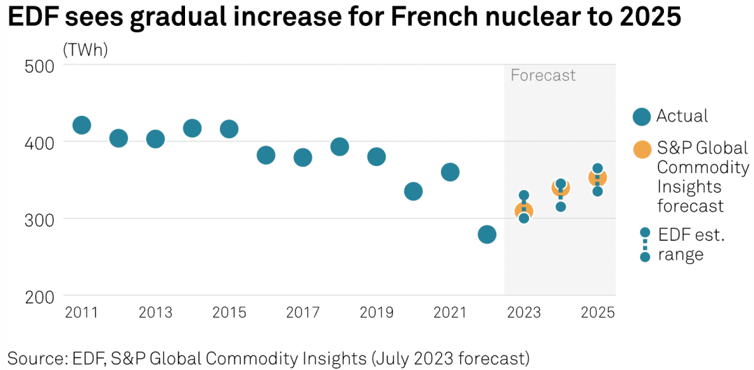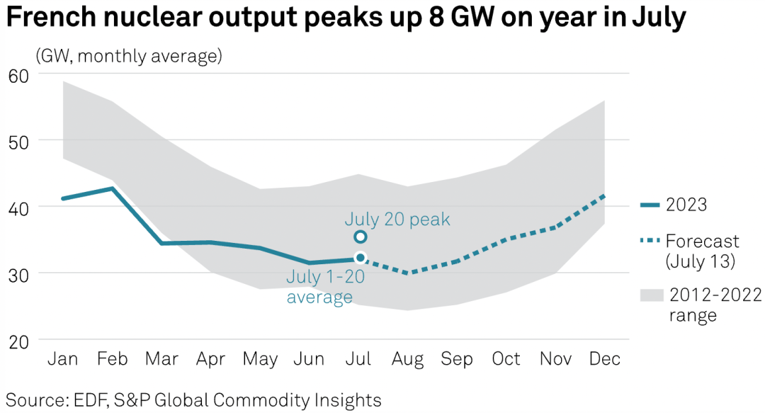 标普全球商品洞察(S&P Global Commodity Insights)的分析师预测,法国核能在今年7月和8月的平均出力为30吉瓦,全年的发电量可达309太瓦时。根据法国电网运营商RTE的数据,7月的平均出力约为32吉瓦。
