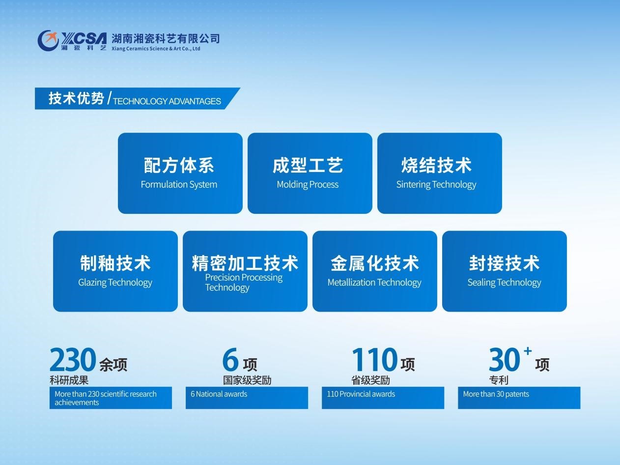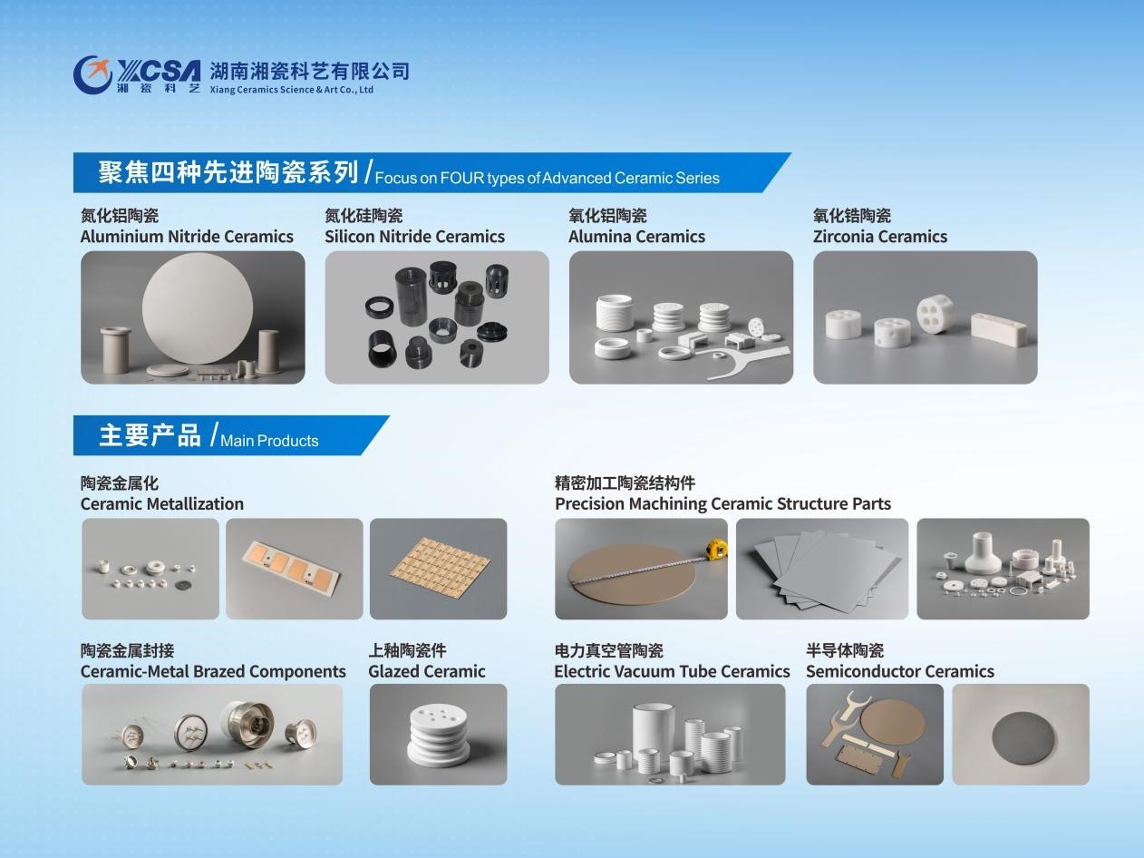 湘瓷科艺传承我国深厚的陶瓷文化底蕴,继承湖南省陶瓷研究所顶尖技术研发实力,坚持“传承、创新、超越、共赢”的企业精神,秉承“人无我有,人有我优。零缺陷,挑战质量极点”的质量方针,一直走在陶瓷新材料、新技术的发展前沿,新材料、新工艺、新技术、新产品层出不穷。湘瓷作为国家授牌的高性能工程陶瓷生产示范基地,生产的氧化铝陶瓷真空管壳、氮化铝粉体、陶瓷基板、陶瓷结构件、陶瓷电子元器件、陶瓷金属化封接组件、电容器外壳等产品已输送到国内外中高端市场。产品广泛应用于电力电子、医疗、半导体、新能源、通讯、石油勘探等多个领域,深受广大客户的肯定与好评。