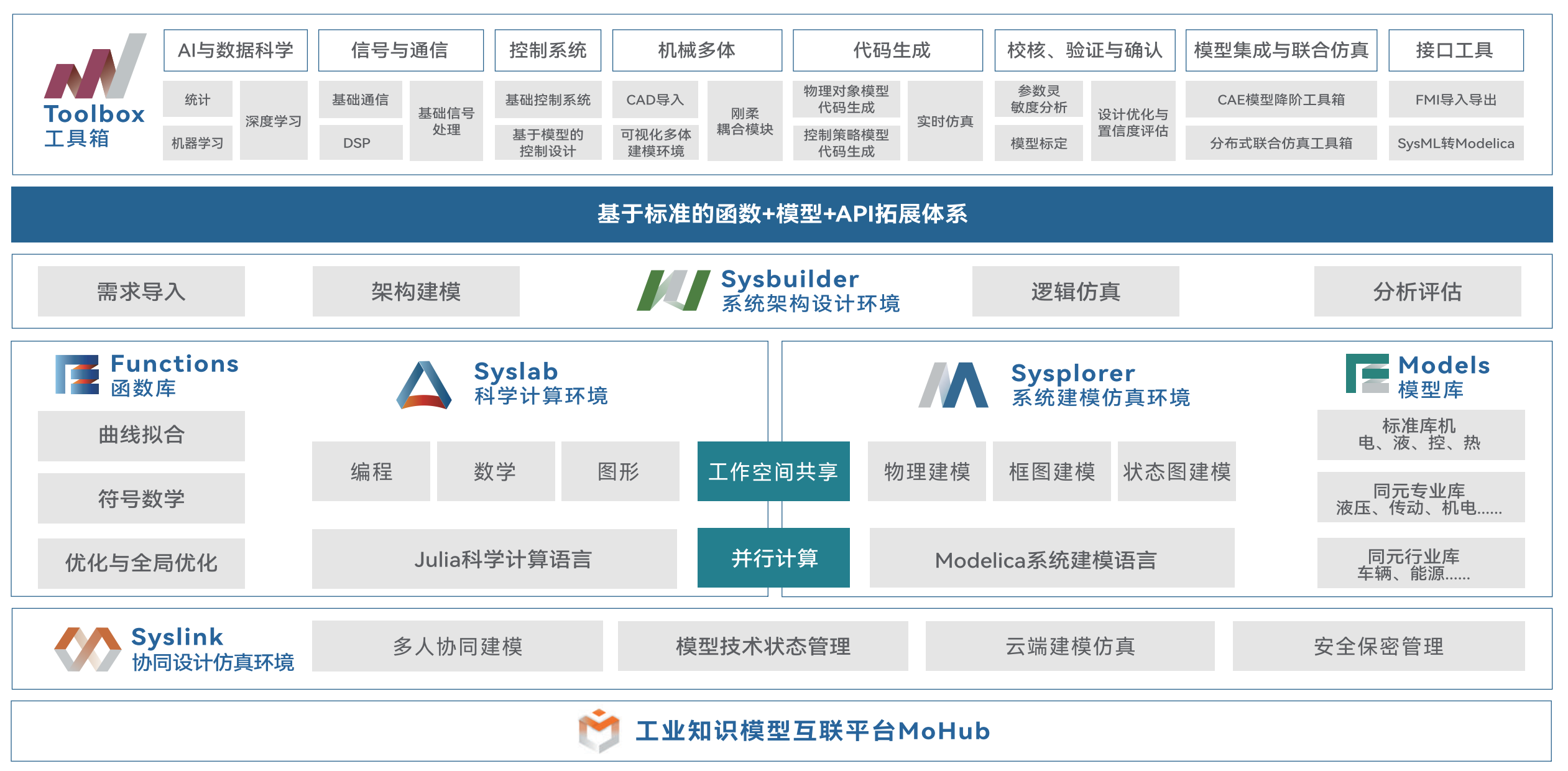 同元软控经过团队二十余年技术积累、公司十多年持续研发,形成核心产品——新一代科学计算与系统建模仿真平台MWORKS。面向不同行业的信息物理装备系统,MWORKS支持基于模型的系统设计计算分析、仿真验证、虚拟试验、运行维护以及复杂装备数字化协同研发。MWORKS由四大系统级产品——系统架构设计环境MWORKS.Sysbuilder、系统建模仿真环境MWORKS.Sysplorer、科学计算环境MWORKS.Syslab、协同建模与模型数据管理环境MWORKS.Syslink——及系列扩展工具箱和模型库组成。其中,MWORKS.Sysplorer是亚太地区唯一一款被Modelica协会官方认可的系统多领域建模仿真环境,完全自主研发的内核是国际上六个商品化Modelica编译求解引擎之一。
