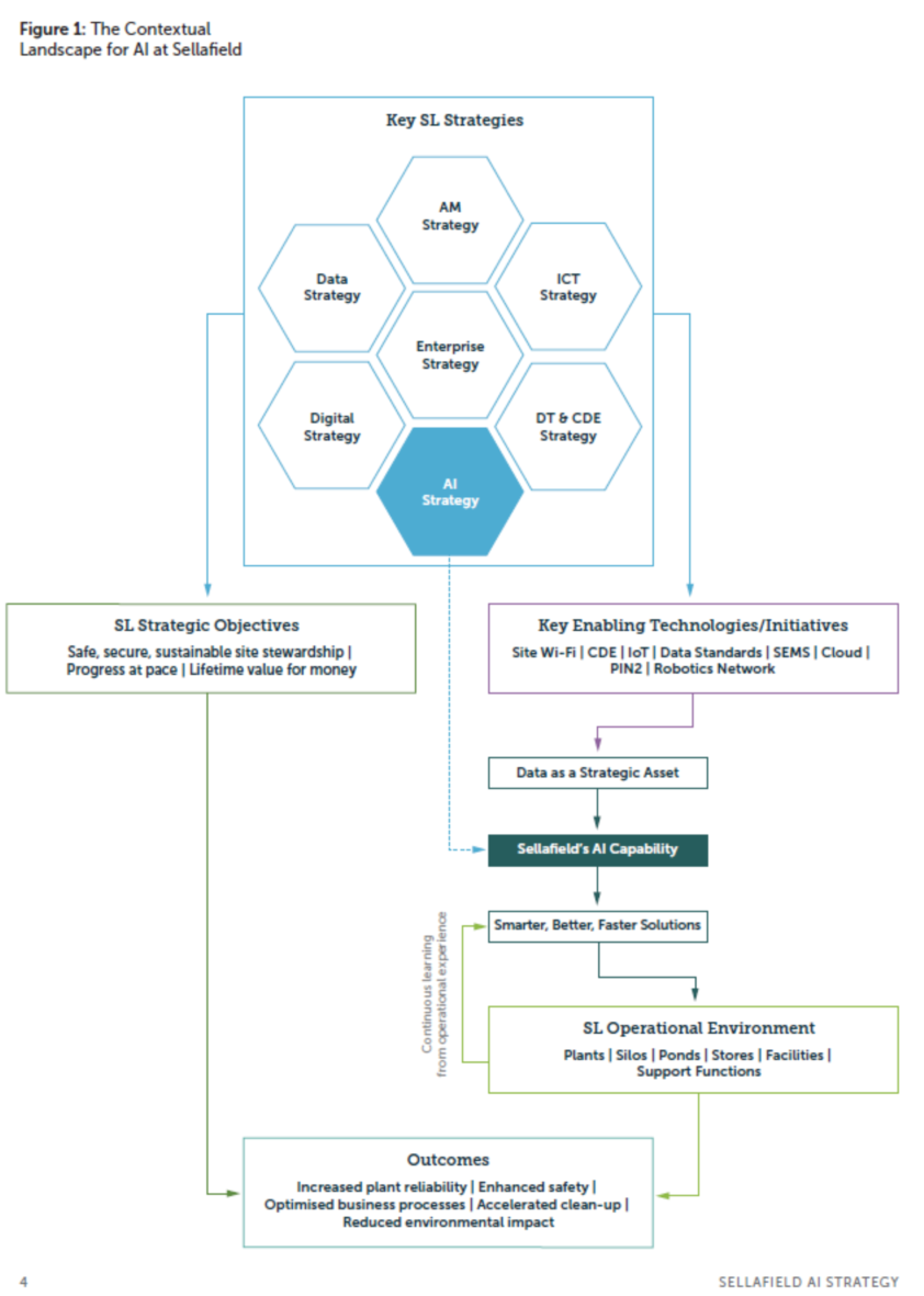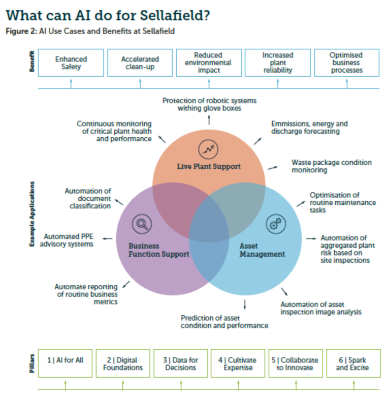 塞拉菲尔德公司在英国核退役管理局人工智能研发活动中发挥着主导作用。人工智能已在该公司许多企业软件(例如MS Teams)中得到应用,是检测和管理网络威胁的基础,并已用于机器人导航和物体识别。但是,除了集成到主流软件或机器人中,人工智能的应用范围有限,多限于部分专家为应对具体挑战而独立研发的人工智能工具。