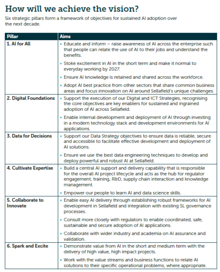 第一大支柱是全员人工智能。一是教育和告知——提高所有员工对人工智能的认识,帮助员工将人工智能与自身工作结合起来,并体会到人工智能益处;二是在短期内激起人工智能应用热潮,并在2027年前成为工作常态;三是确保员工能够获得并共享人工智能知识;四是采用其他行业在人工智能方面的最佳实践,并针对塞拉菲尔德的独特挑战开展人工智能创新。