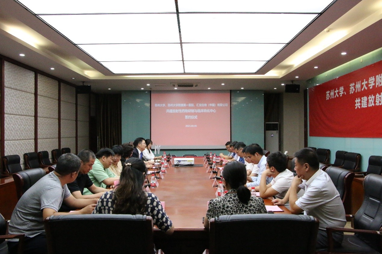 2023年8月5日下午,苏州大学、苏州大学附属第一医院、汇佳生物(中国)有限公司共建放射性药物研制与临床转化中心签约仪式在苏州大学独墅湖校区医学楼一楼会议室成功举行。出席签约仪式的有苏州大学党委常委、副校长李孝峰,苏州医学院放射医学与防护学院院长柴之芳院士,苏州大学附属第一医院常务副院长、药物研究与转化交叉研究所所长缪丽燕;汇佳生物(中国)有限公司董事长兼CEO张阳、副总裁姜海霞;苏州大学科技党委书记蒋敬东以及学校相关职能部门领导出席参加;放射医学与辐射防护国家重点实验室主任王殳凹、放射医学与防护学院党委书记王成奎出席;会议由王成奎主持。