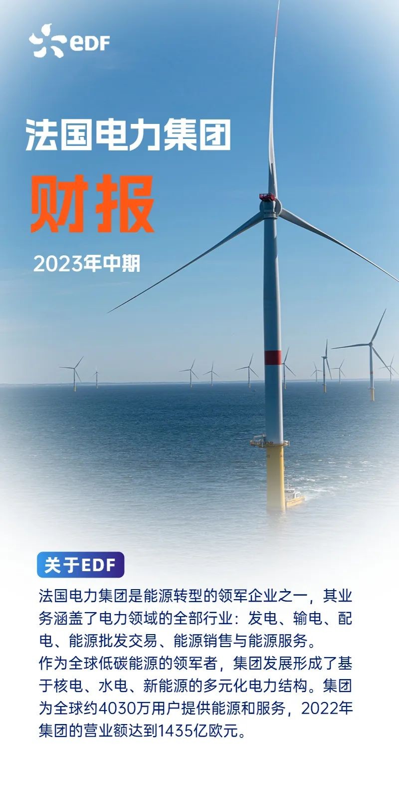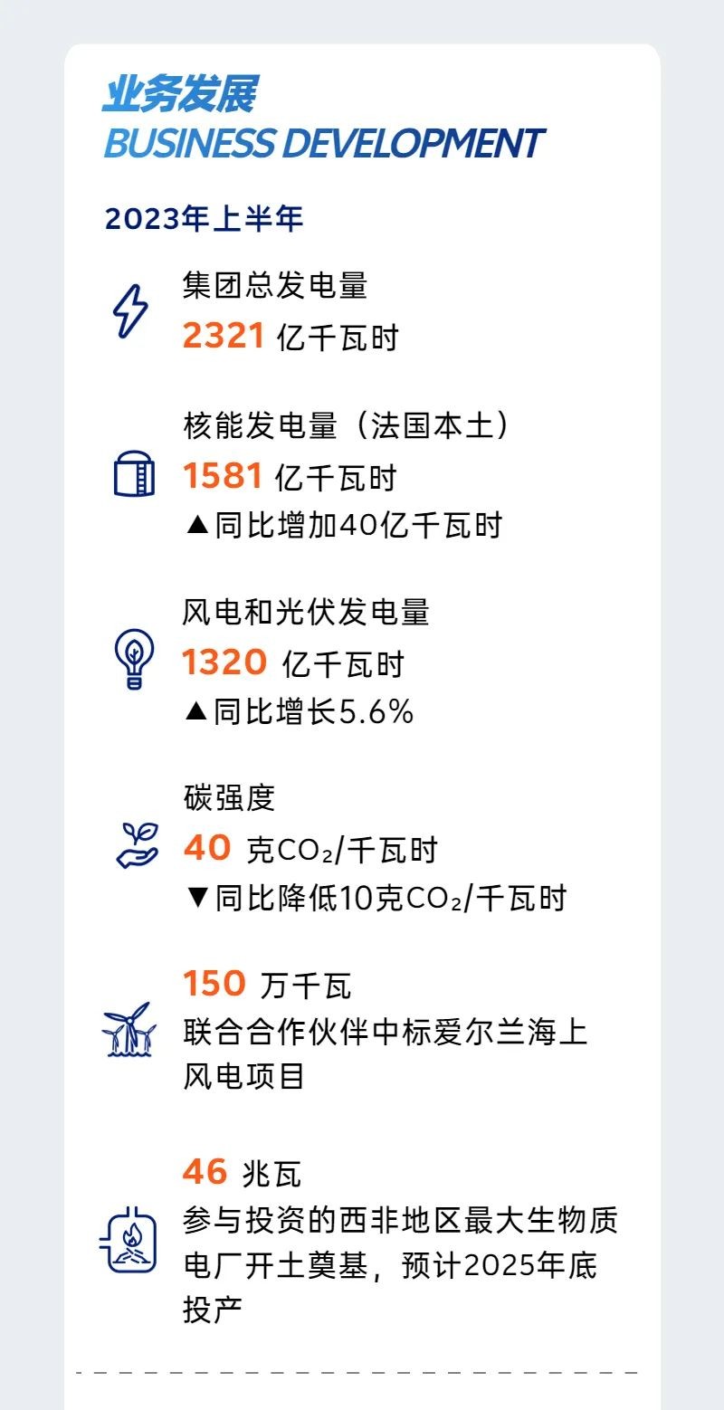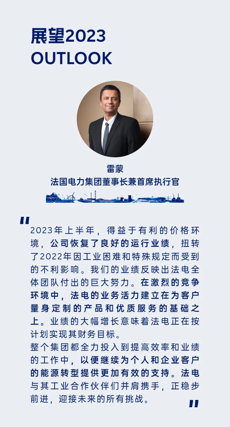法国电力集团是能源转型的领军企业之一,其业务涵盖了电力领域的全部行业:发电、输电、配电、能源批发交易、能源销售与能源服务。 作为全球低碳能源的领军者,集团发展形成了基于核电、水电、新能源的多元化电力结构。集团为全球约4030万用户提供能源和服务,2022年集团的营业额达到1435亿欧元。