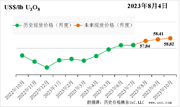 7月份现货交易疲软,价格波动缓幅收窄,位处55.40-56.25美元区间。7月第一周现货交易延续此前冷清的节奏,现货价格缓慢下跌;进入中旬,负责运输俄天然铀产品的船运公司无保险公司承保,俄铀产品交付存在延期风险,现货市场略显紧张,价格从55.40美元上涨至56.15美元;最后一周,尼日尔出现政变,该国当前唯一在运的Somair铀矿产品暂停向外供应,促进铀价上涨,一天后美联储继续加息25个基点,抑制铀价上涨,两个事件对冲,暂未影响现货市场,月底价格收于56.25美元。