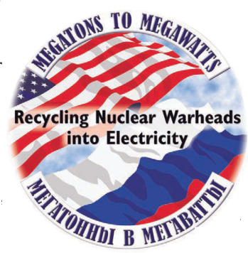 USEC赠送了透明的塑料镇纸来纪念这一铀稀释事件,上面有一个用英语和俄语写着“兆吨到兆瓦”的彩色标志,两国的国旗——红、白、蓝——在微风中飘扬。