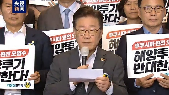 22日下午,韩国共同民主党党首李在明谴责日本福岛核电站核污染水向海洋排放。(图片来源:央视新闻)