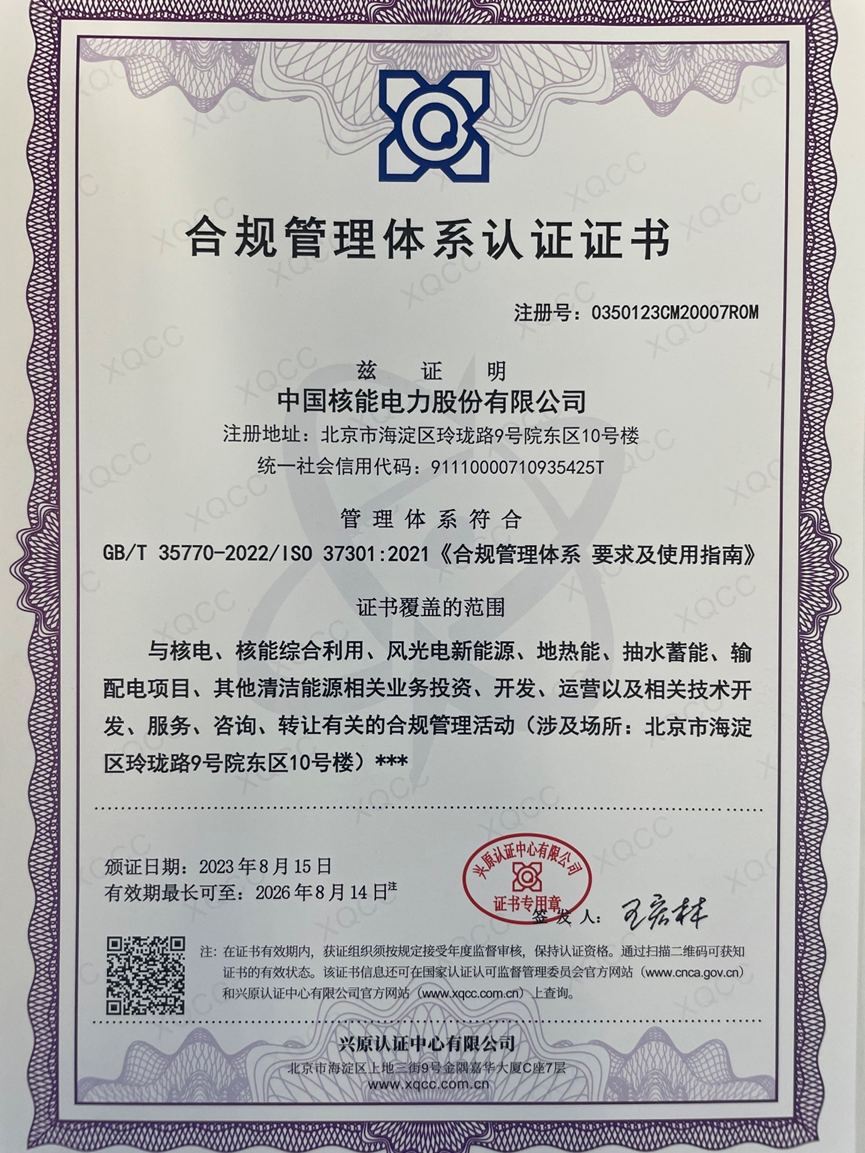 中国核电合规管理工作将以此次认证为契机,通过建体系、强机制、创品牌,不断完善合规管理体系,创新优化合规管理手段,让“人人、事事、时时”合规的理念深入人心,真正做到“我要合规”,把“依法合规”做成中国核电的价值品牌,为中国核电建设世界一流清洁能源企业保驾护航。