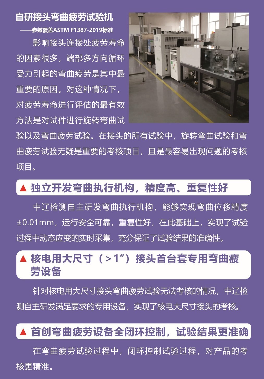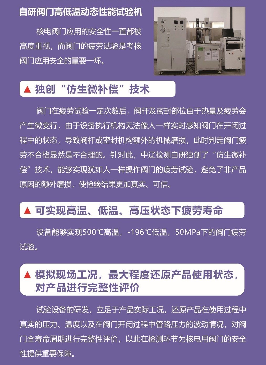 公司获得中国合格评定国家认可委员会(CNAS) 认可、检验检测机构资质认定(CMA)、中国船级社(CCS) 认可、核工业质量管理体系认证、武器装备质量管理体系认证,已广泛服务于核电、输变电、航空航天、轨道交通、工程机械、石油石化、船舶海工、氢能源、半导体及军工等领域,并形成了建筑隔震柔性管路检测技术、仪表管阀件检验检测、波纹管高低温内外介质工况检测、双维运动补偿器测试、管路燃烧测试、航空零部件阻燃检测、紧固件测试与分析等多项专有技术及装备,获得国内外客户广泛认可。