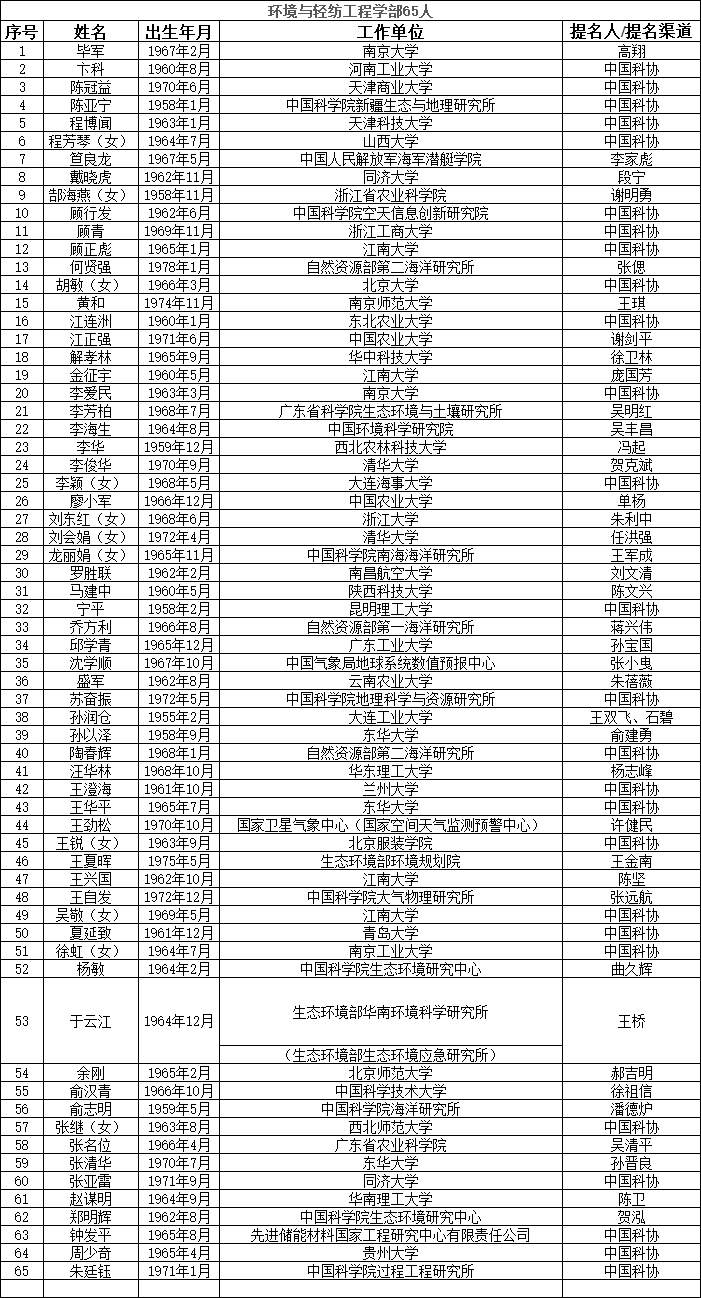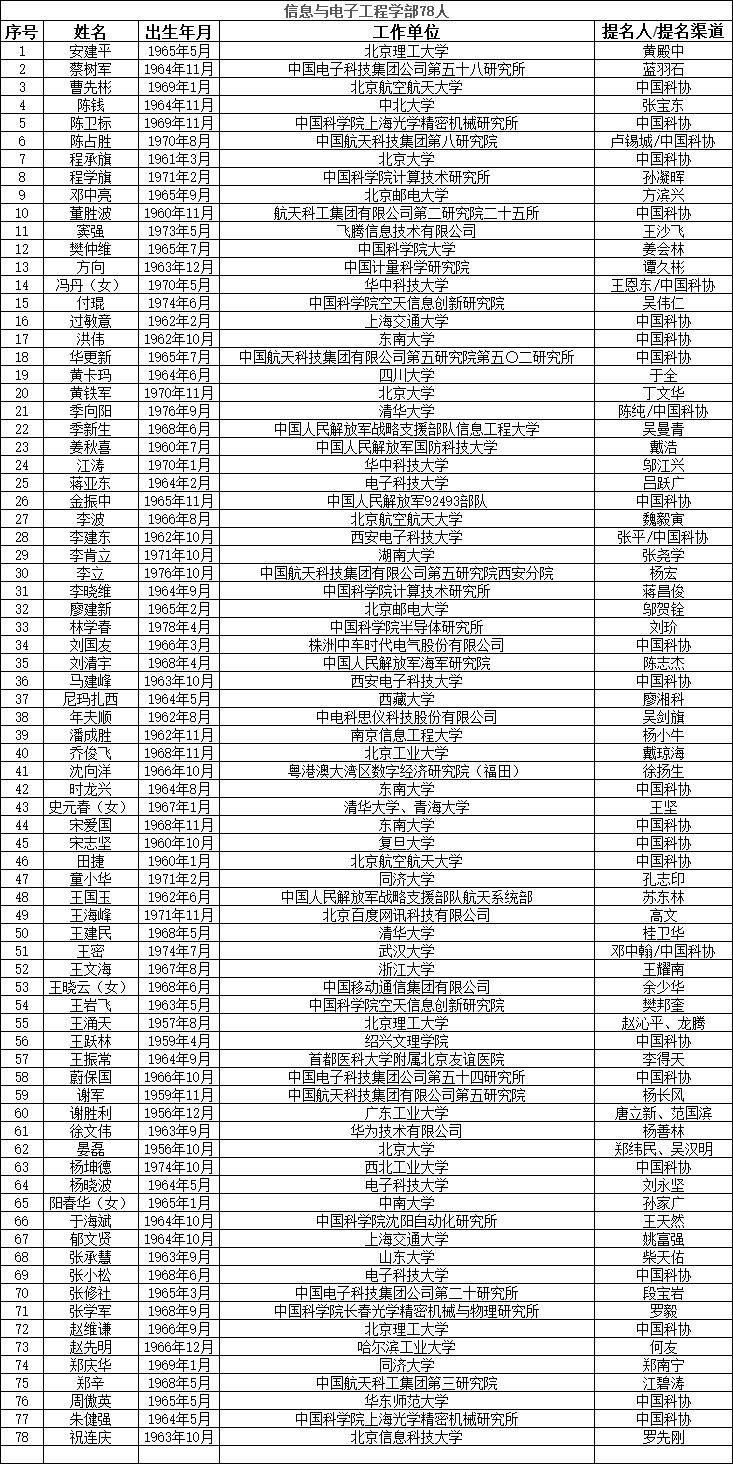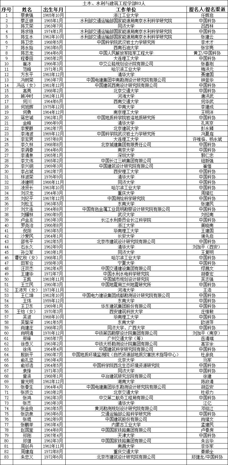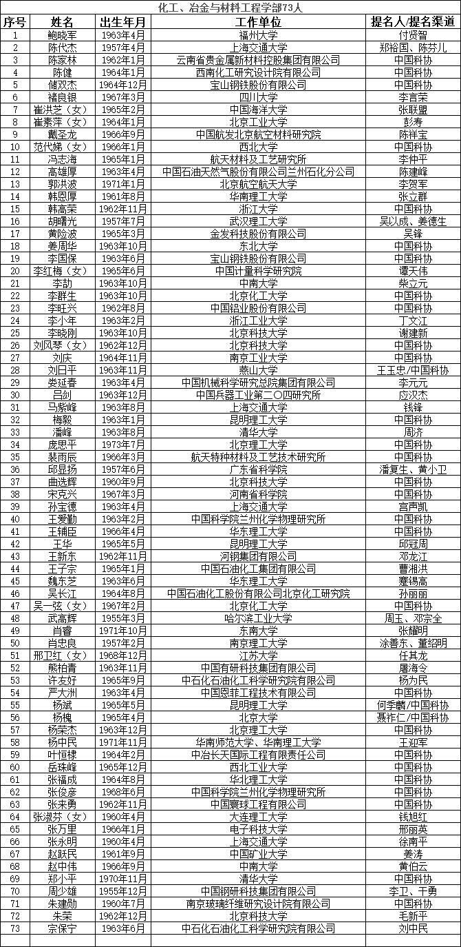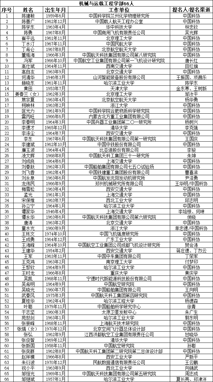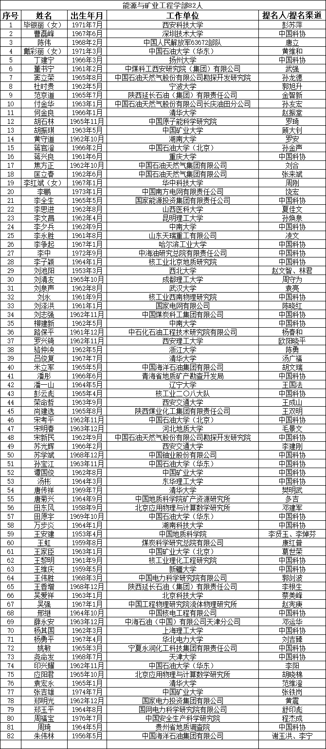 中国工程院2023年院士增选提名工作已经结束。经中国工程院第八届主席团第六次会议审议,中国工程院党组审定,确认中国工程院2023年院士增选有效候选人655人。根据《中国工程院院士增选工作实施办法》的规定,现将有效候选人名单予以公布。