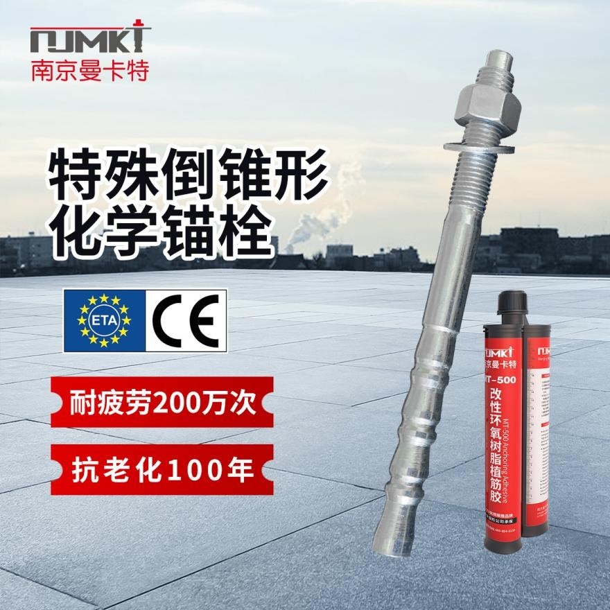 曼卡特特殊倒锥形化学锚栓,是由平垫,螺母,螺杆组成的一种金属化学锚栓,配合植筋胶使用。基理是依靠胶粘剂的粘接作用,使得外部力经螺杆、胶水传递到基材混凝土上,借鉴机械锚栓的锁键效应原理,在受力上,特殊倒锥形化锚锚固的可靠度得到大幅度提升,即便是混凝土破坏时也会控制为锥体受拉破坏状态。产品通过抗疲劳200万次试验,耐火性能120min测试,通过欧盟“ETA”机构组织的性能测试认证。
