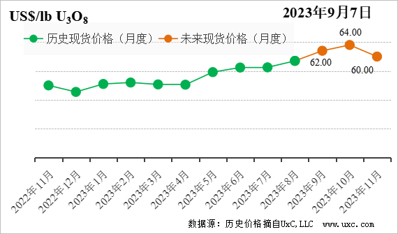 8月份现货交易先抑后扬,价格上涨至61.10美元。8月初,欧盟表示,拥有充足的天然铀库存应对尼日尔短期供应中断风险,现货交易延续此前冷清的节奏,现货价格缓慢抬升;最后一周,法国与蒙古国达成协议,将推动在蒙古的铀矿开发,侧面反映法国将拓展更多渠道化解供应风险,现货市场略显紧张,贸易商频繁采购,价格在两天之内从58.50美元上涨至61.10美元。