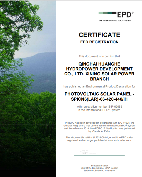 为进一步打造国际化零碳品牌,黄河公司加大品牌建设及推广,协同国际绿电低碳认证(青海)研究工作室,对高效IBC组件产品开展国际EPD体系认证,通过了国际EPD体系严苛的数据收集和模型计算,最终以数值为每瓦384克碳排放的较低数值通过国际EPD体系技术委员会专家审核,成功在国际EPD体系注册,获得了国际EPD认证证书。