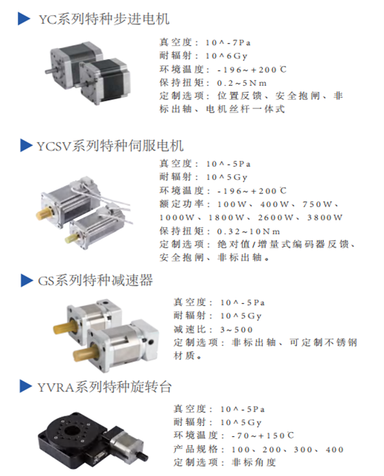 公司专业解决极端环境的特种电机(步进和伺服),主要使用环境有:耐辐射10^6Gry、真空1.0*10^-7pa、深低温-196℃、高温+200℃;同时可扩展抗冲击、耐盐雾、抗霉菌等性能特性。