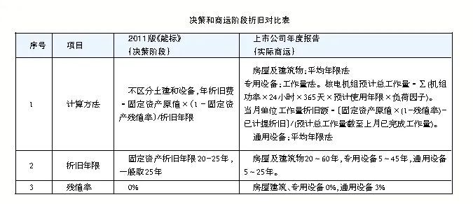 核电决策阶段的财务评价主要依据《核电厂建设项目经济评价方法》(NB/T20048-2011),该文件(以下简称《能标》)是国家能源局依据国家发改委《建设项目经济评价方法》和《建设项目经济评价参数》等规范文件,围绕二代改进型核电机组的技术参数、运行情况等组织制定和颁布的行业标准。其中提出,核电项目折旧费按年限平均法计算,折旧年限一般取25年。根据上市公司年报,在运行阶段,房屋及建筑物采用平均年限法进行折旧,与《能标》基本一致,折旧年限房屋及建筑物20~60年;核电专用设备采用工作量法进行折旧,折旧年限5~45年,与《能标》存在差异,商运会计折旧年限整体较《能标》折旧年限长。
