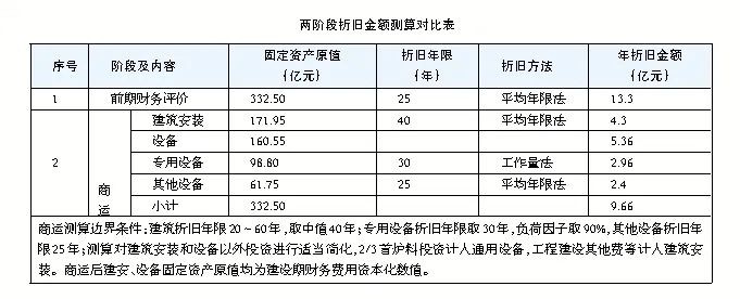根据国内某核电概算,三代核电投资中核电设备投资占工程投资约50%、占基础价37%,设备投资占比较高。商运阶段,设备折旧年限变化叠加专用设备折旧方法的变化,对商运后核电项目总体折旧产生明显影响。以建成价350亿元(固定资产形成率95%)模拟固定资产原值,用不同方法测算前期决策和商运阶段折旧金额,商运阶段年折旧明显下降。