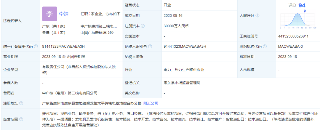 据天眼查App显示,9月16日,中广核惠州第二核电有限公司成立,法定代表人为李靖,注册资本3亿元人民币,经营范围含发电业务、输电业务、供(配)电业务、港口经营、发电机及发电机组销售等。该公司由中国广核集团有限公司全资持股。