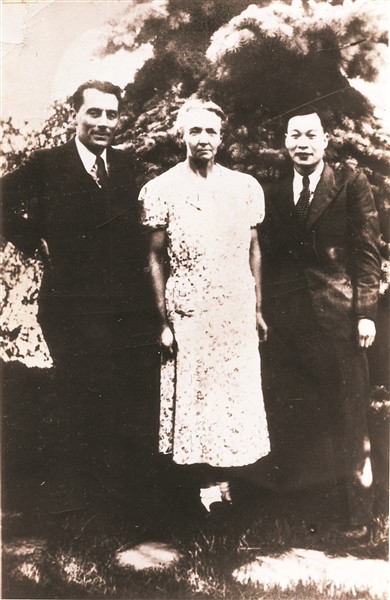 图④ 钱三强(右)回国前与导师约里奥-居里夫妇合影。