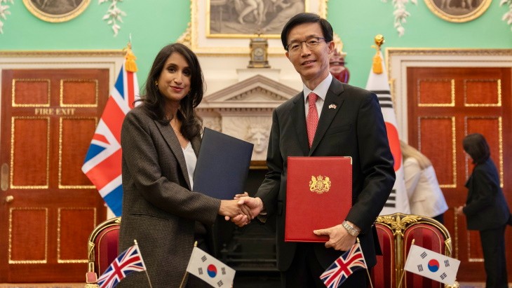 英国能源安全大臣克莱尔·库蒂尼奥(左)和韩国贸易、工业和能源部长 Bang Moon Kyu 签署清洁能源协议(图片来源:@ClaireCoutinho)